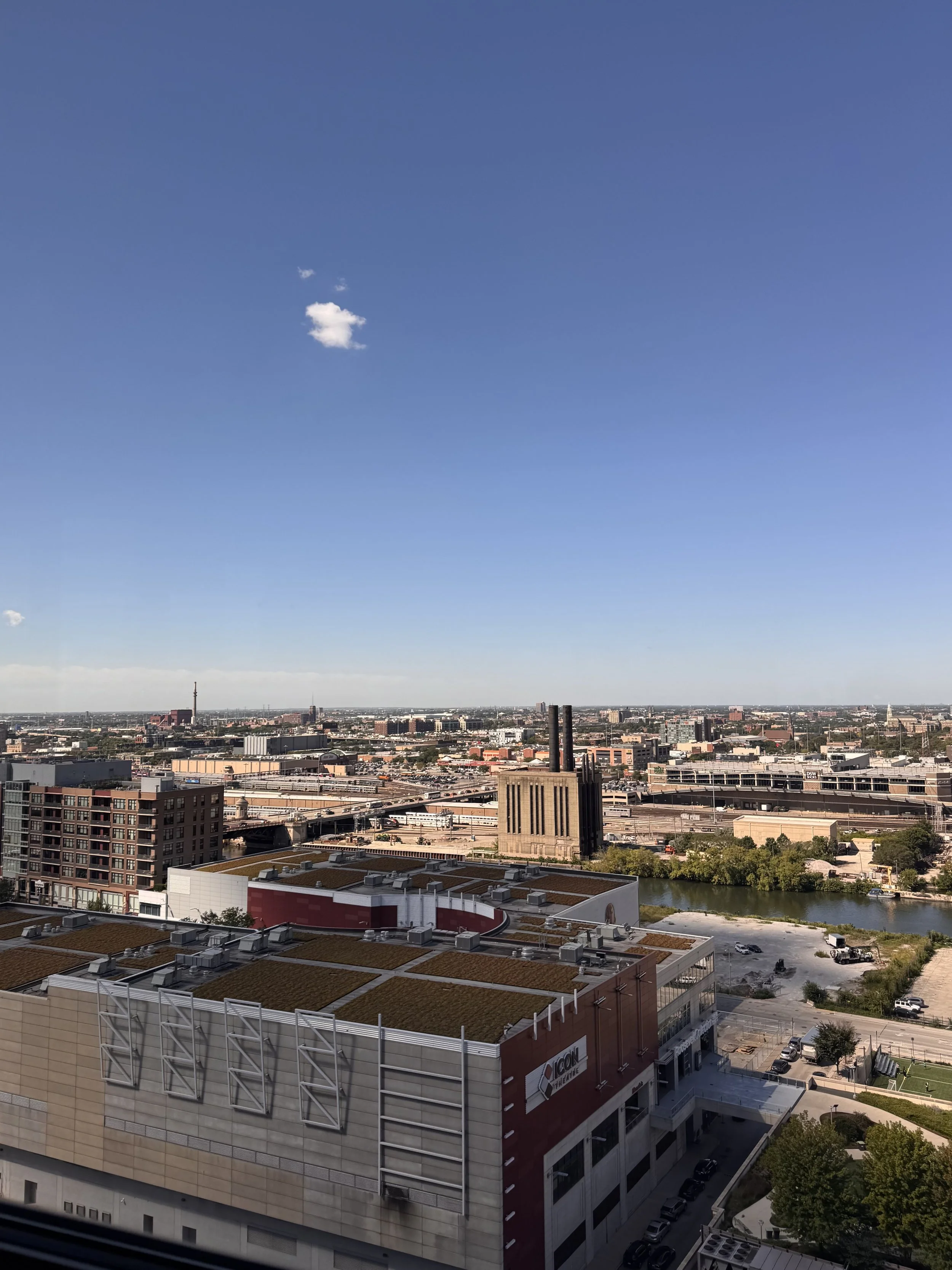 I describe our view as being like Las Vegas in the daylight. At night it shines and sparkles- there is movement of cars on the Dan Ryan and cutting across Roosevelt, boats float past along the river for twilight city tours, and planes dot the sky in their line ups into Midway and O’Hare (our building is in a very opportune spot to be able to observe traffic in and out of both airports).