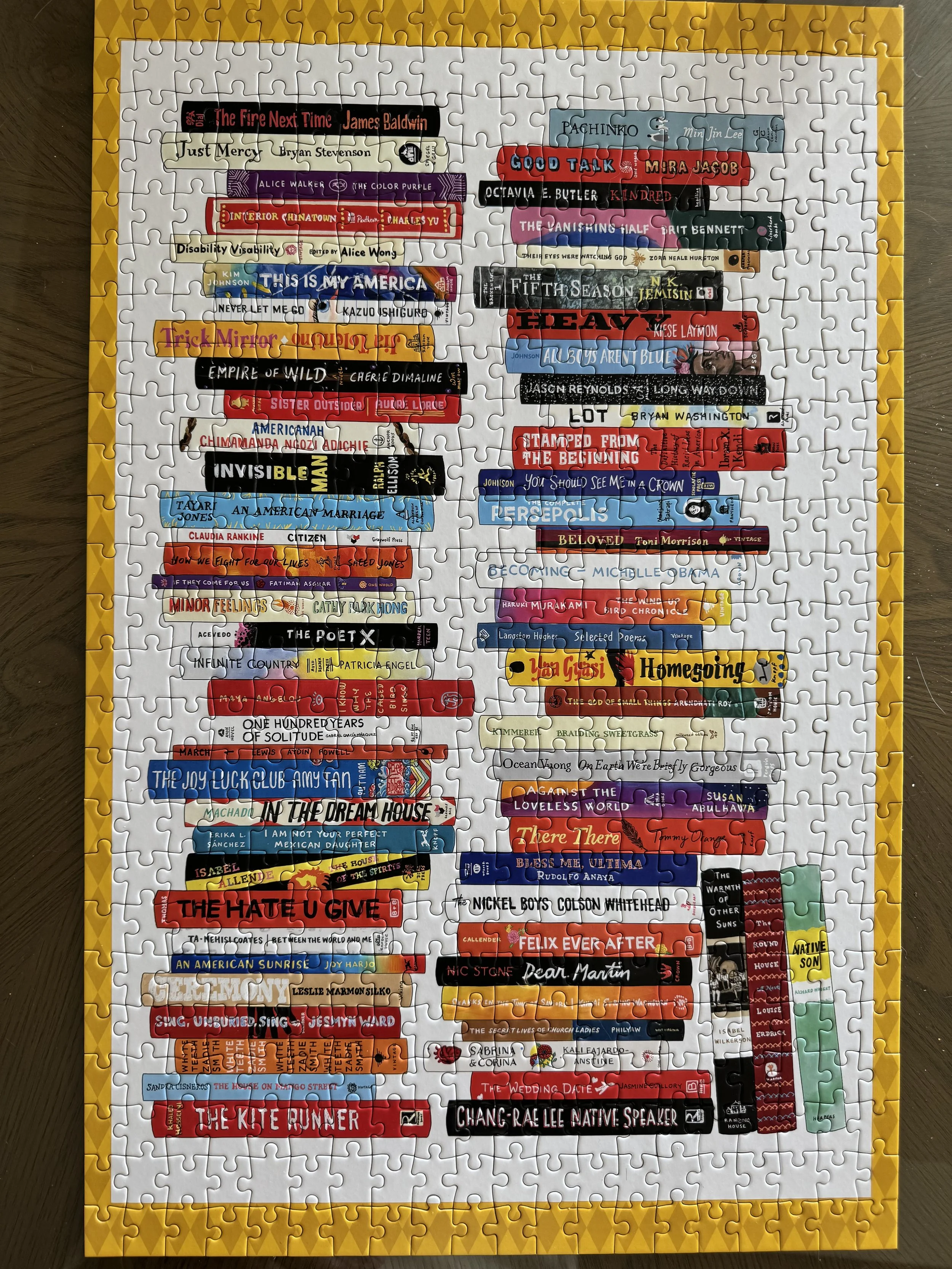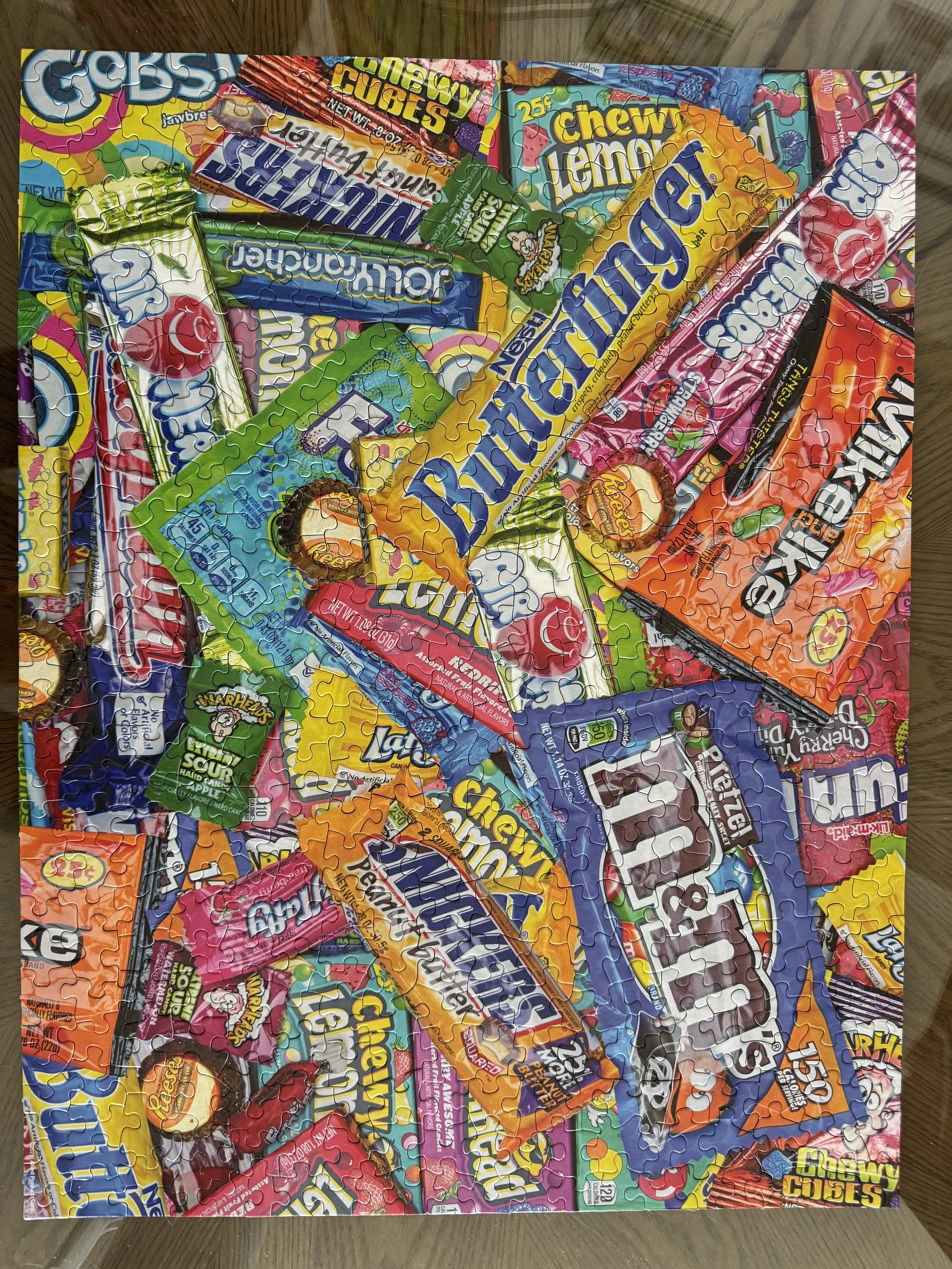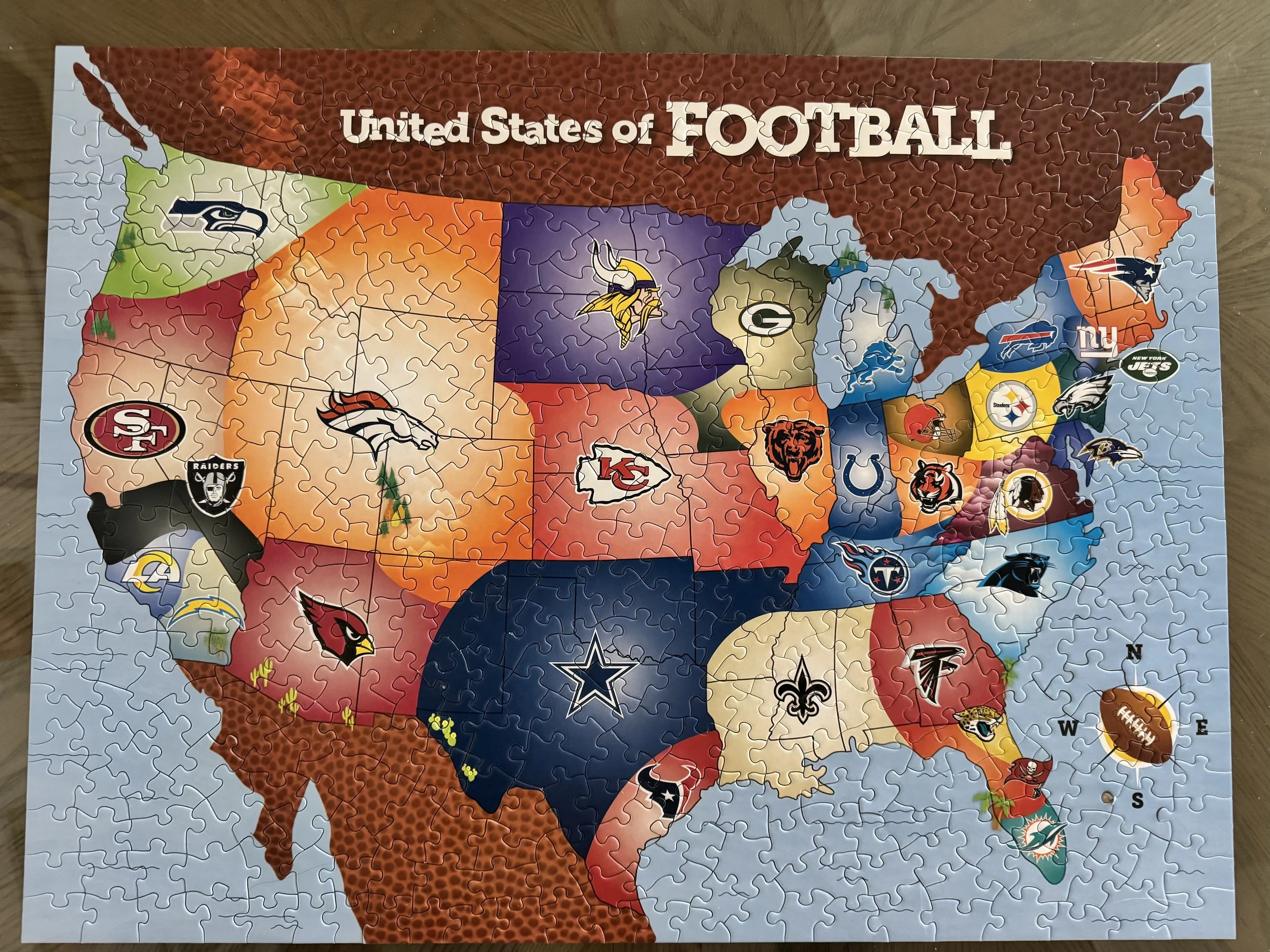 In the morning, on a whim, I set out this football puzzle on our dining table, and miraculously the family tended to it throughout the day. We even had some fun! I have never considered myself a huge puzzle person and we have the added complication of C-A-T-S, including one who likes to run off with puzzle pieces in his mouth (Bean….). But over the past few years we have acquired several (puzzles, not cats, though we’ve acquired a couple of those as well) that have actually ended up being quite enjoyable. Five hundred pieces is my sweet spot- you know you can get a 500 piece puzzle done in one day :)