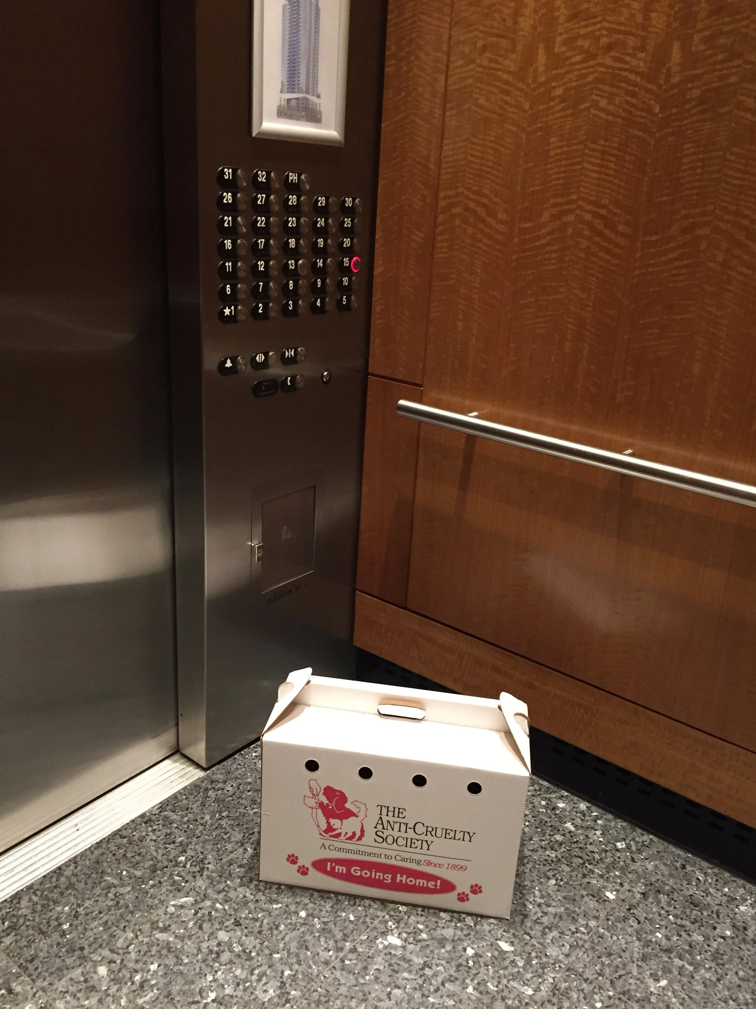 “Hey guys! Mommy’s going to be right back! Watch your show!” I raced out to the elevators with the kennel. The elevator seemed to take forever, and when I got to floor 7 Jim was waiting. He grabbed the kennel and ran into the apartment on the corner, where our front desk man was standing, holding the door open.