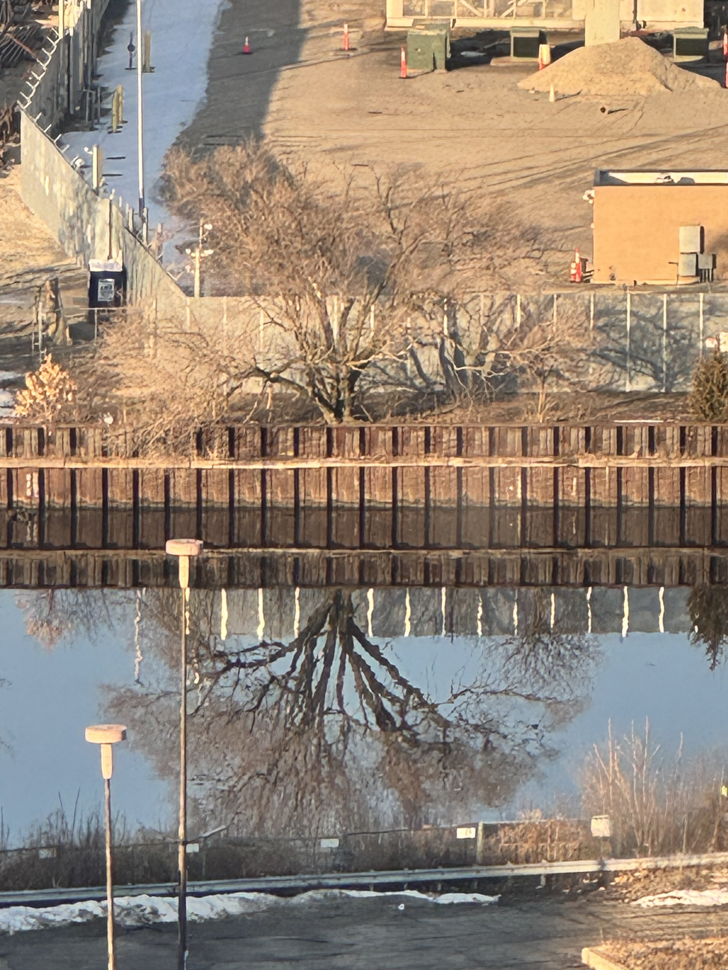 And this makes me sad, as you will see below- we are about to lose this section of our river view, including this glimpse of reflected trees and their stark branches, and the way they catch my eye on a winter morning.