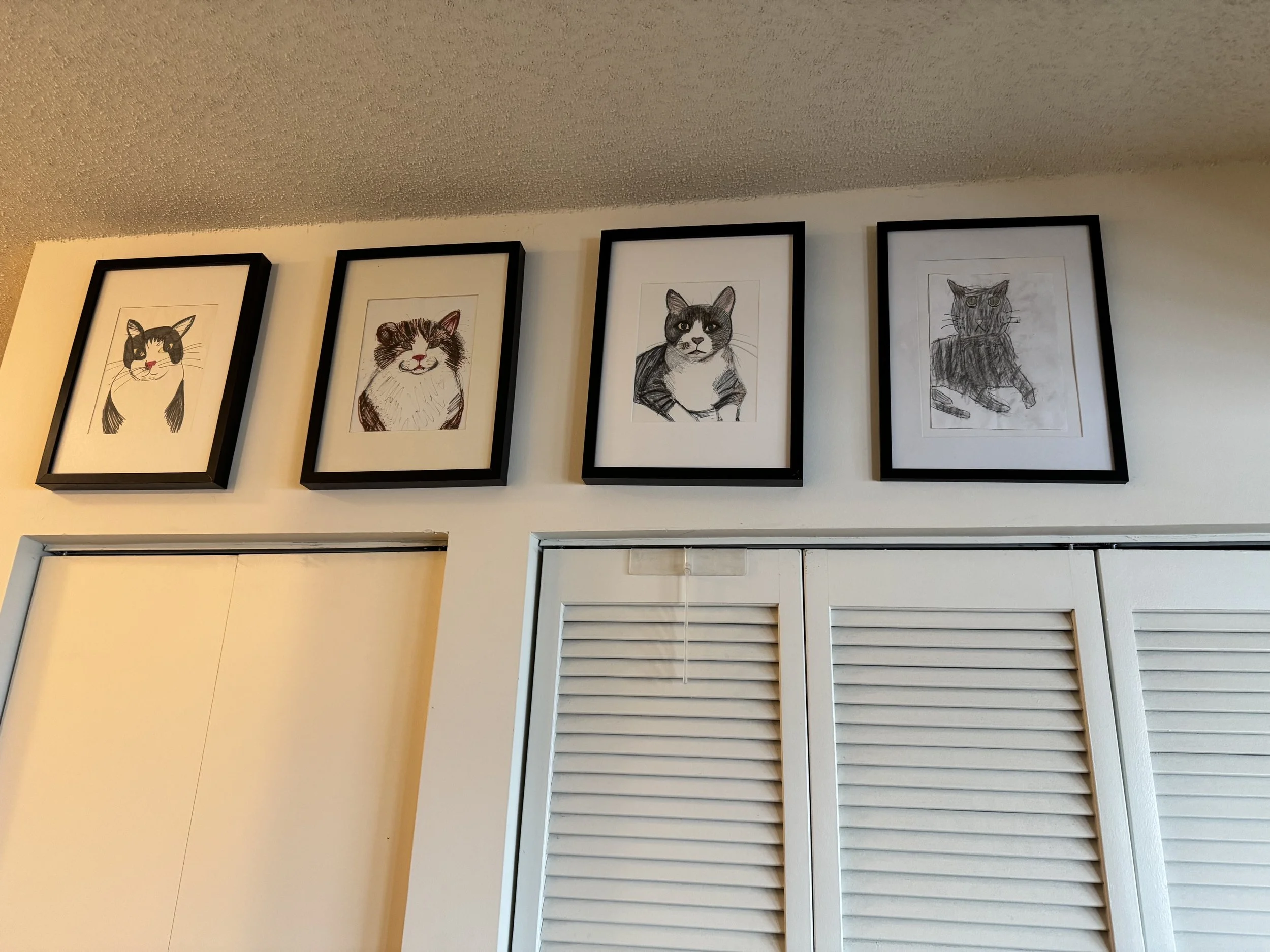 And while Jim and I have yet to find ourselves in our permanent home, we at least can still pound some nails in the wall! We had a family wall in our old apartment in Lincoln Park, and a couple weekends ago I started to recreate this space in our new home in Roscoe Village. I decided to place the pictures along the wall that is at your back when sitting at our desk. That way we can glance at the wall when entering the room and sitting down at the desk to work, but can go ahead and be productive without continuously staring at everyone's picture (I'm not sure if Jim would do this, but for me, I would find myself staring off into space if I had all those pictures within view! ). We have a LOT of wall space in this new place, and I wanted to share the feline portraits that we now have framed in our kitchen. The black and white cat was Oliver. I actually drew that with magic markers 3 years ago and hung it near his litter box (I'm a total weirdo when it comes to our cats- I understand this). I could never find it in my heart to get rid of this picture, and on a whim I framed it. Then I thought, well, we now also need a picture of Major! So I sat down with the markers and created Major's portrait. It's okay if you think we're both bizarre for hanging these, but we love them. Major is pleased too.