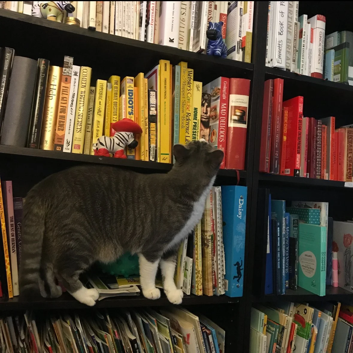 I can’t find a pic from when we color coded our bookcase in 2009, but I did find this one from 2017 (with our cat Grady) where you can see we were still shelving by color.